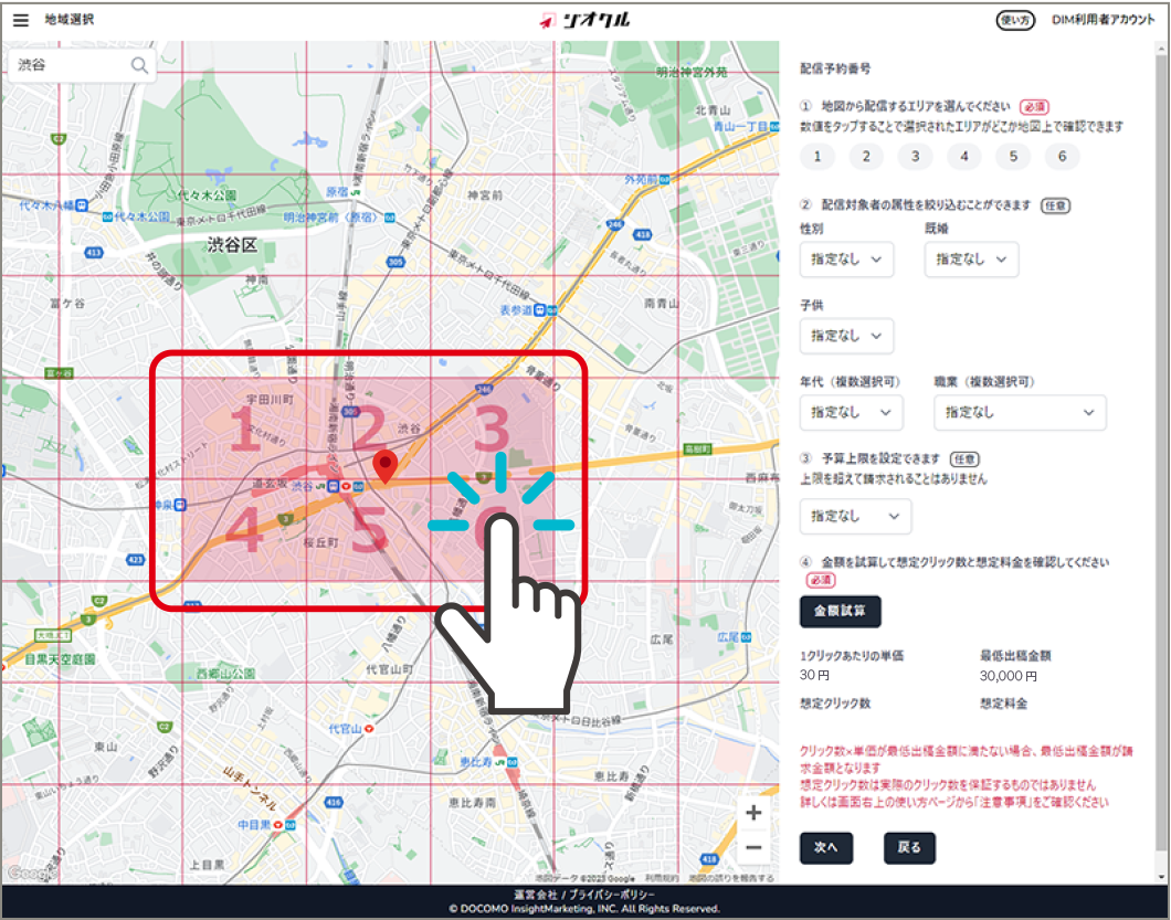 渋谷エリアを選択してプロモーションを配信した場合の利用料金例です。